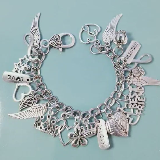 Chunky Charm Bracelet with Lots of Charms /Angel Wings / Entwined Hearts /7 In
